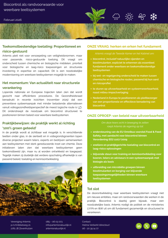 Artemis vraagt geen versoepeling van veiligheidseisen. Wij vragen een passend systeem. Dat betekent: onderscheid tussen chemische en biologische routes in wet- en regelgeving, een risico-gestuurde en proportionele toelating van biocontrol, en beleid dat stuurt op systeemweerbaarheid in plaats van alleen op middelreductie. Nederland kan en moet hierin in Europa het voortouw nemen.